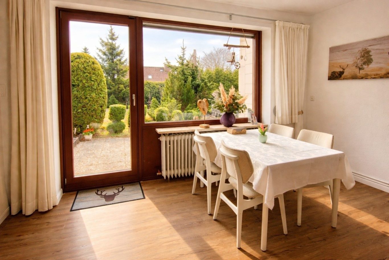 Von hier aus hast du einen herrlichen Blick auf die eigene Terrasse und den großen Gemeinschaftsgarten mit den angrenzenden Bäumen. Ob für ein gemeinsames Essen, einen gemütlichen Spieleabend oder einfach nur zum Sitzen und die Aussicht ins Grüne genießen – hier ist der perfekte Platz dafür.