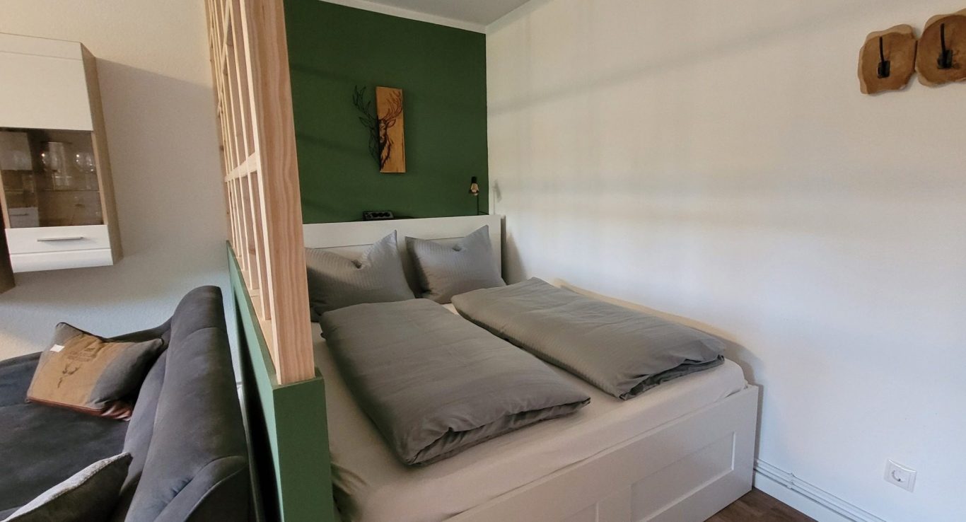 In unserem Schlafzimmer findest du den perfekten Ort, um nach einem erlebnisreichen Tag in der Natur zur Ruhe zu kommen. Das große, bequeme Bett lädt dazu ein, sich einfach fallen zu lassen und die Seele baumeln zu lassen. Die Einrichtung ist schlicht, aber gemütlich – so kannst du hier richtig abschalten und neue Energie tanken.