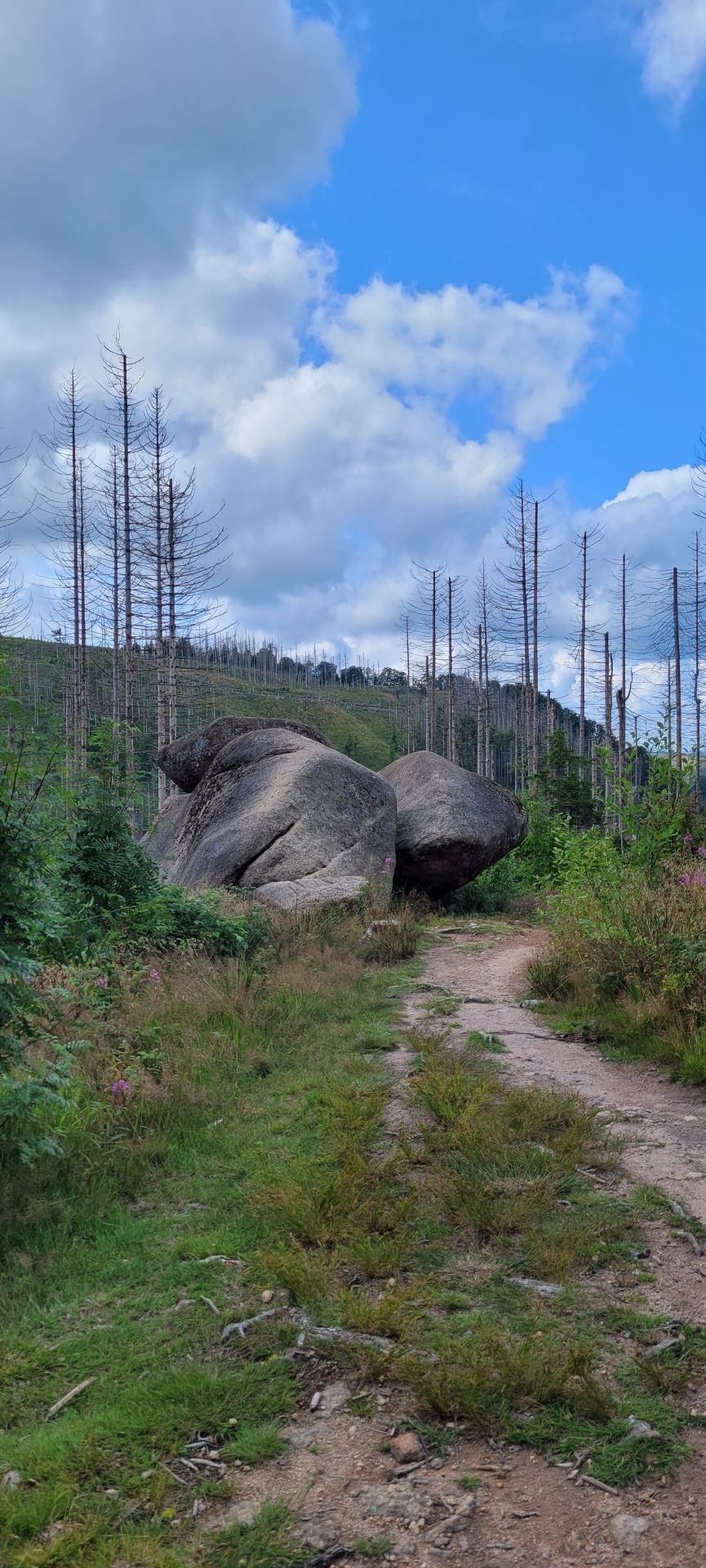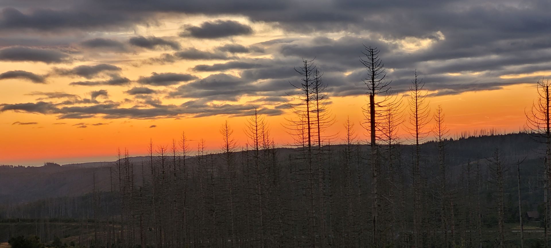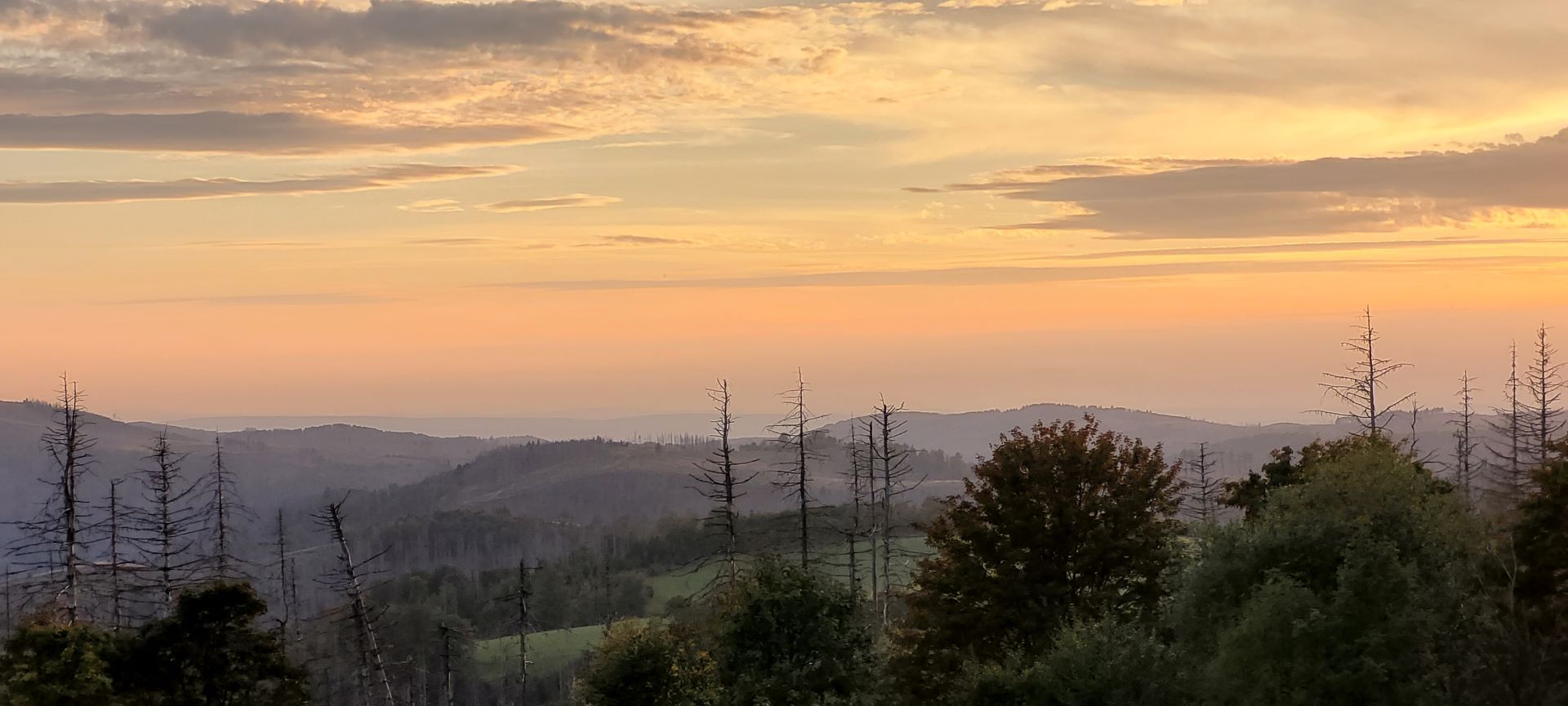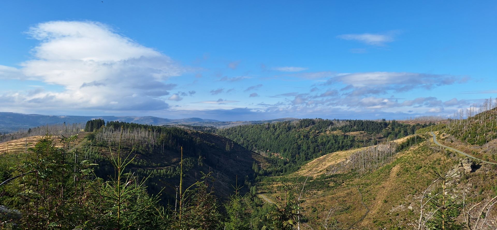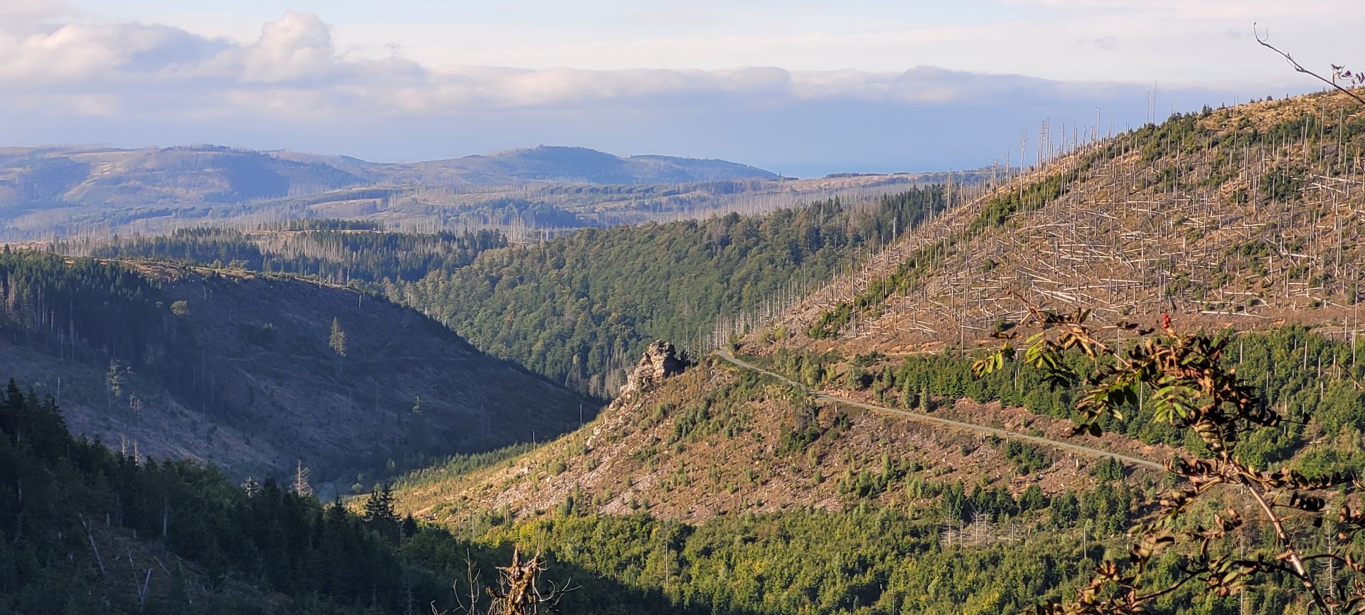 Nach gut 2 km ohne dramatische Höhenmeter erreichst du die Achtermannshöhe. Ja, der Borkenkäfer hat hier mächtig zugeschlagen. Dennoch ist die Aussicht vom Achtermann inklusive Brocken- und Wurmbergblick grandios.